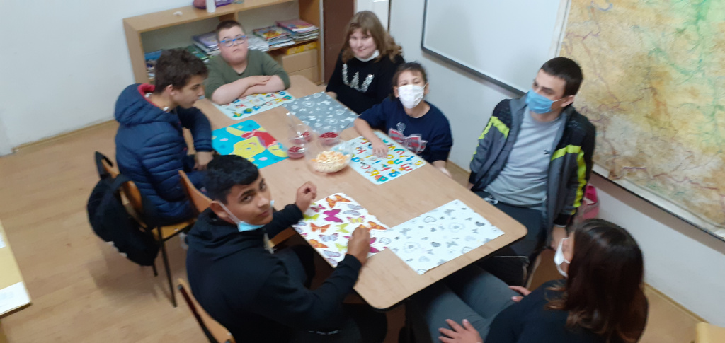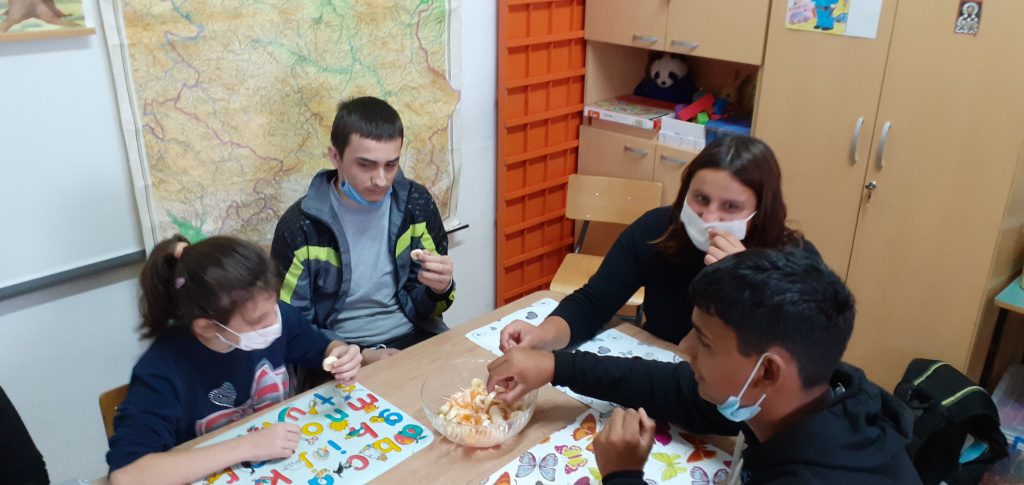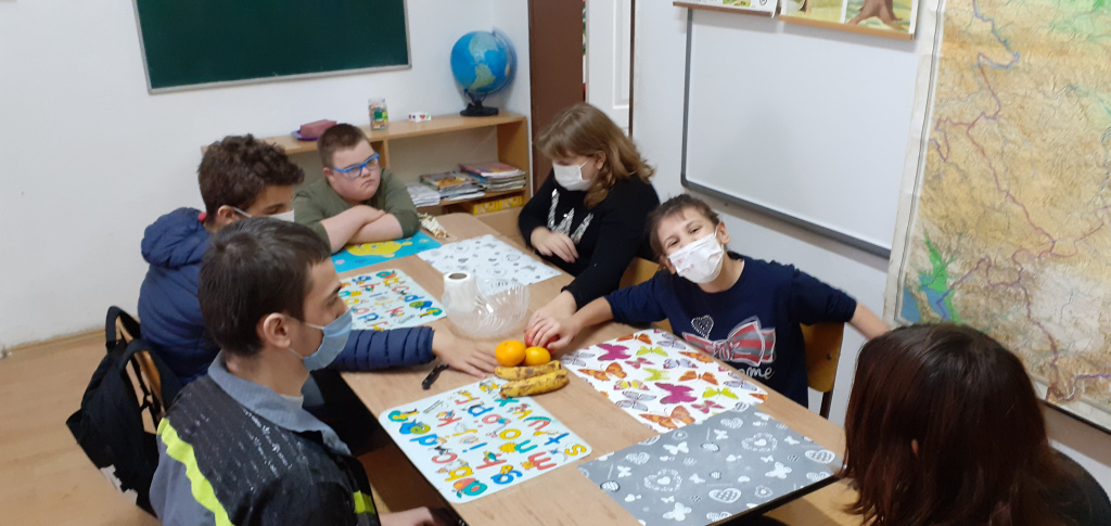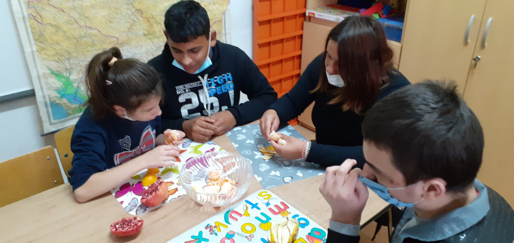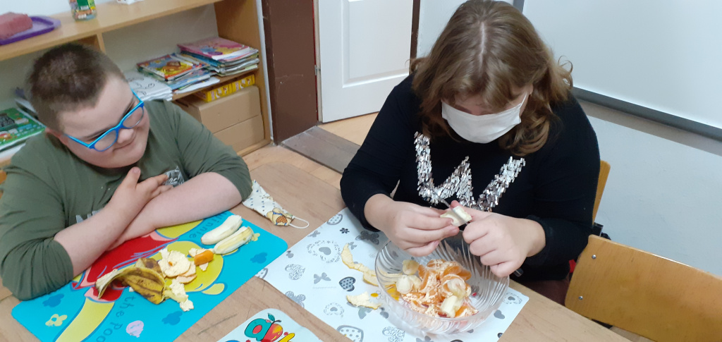активности при сецкању банане на колутиће и чишћењу нара, али они су показали вештину чишћења воћа поготово нара који је најзахтевнији и коришћења ножића при сецкању банане на једнаке колутиће, гуљењу мандарина и раздвајању на кришке. Уз помоћ припремили радни простор и потребан материјал и алат, на крају расклонили и вратили све на своје место. Делили су материјал и алат, чекали на свој ред, делили воће на једнаке делове, што је за сваку похвалу. Фотографије потврђују радну атмосферу, задовољство, а празне чинијице да је направљена воћна салата била јаааако добра.