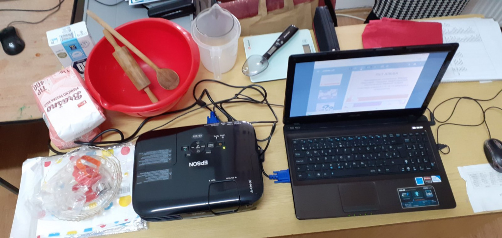 Дигитална вага и кашика (брашно и со), мерица за мерење запремине (вода), креда, табла, фотоапарат |
