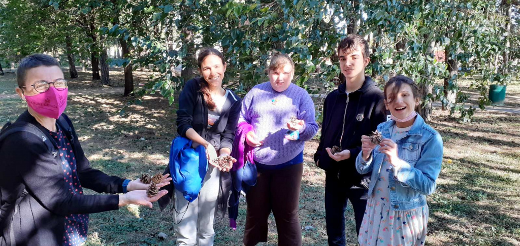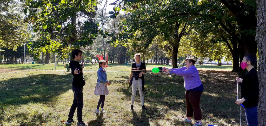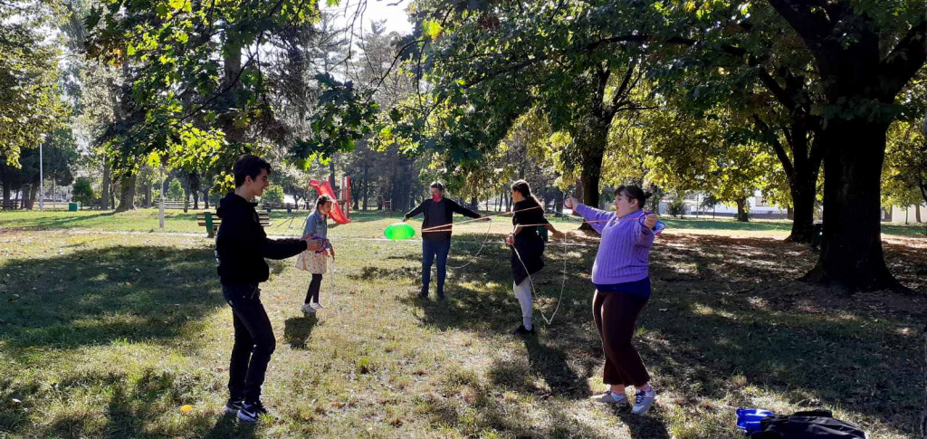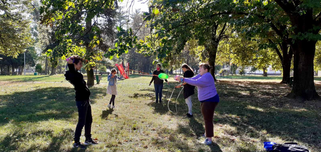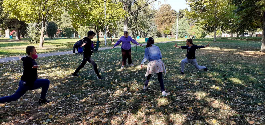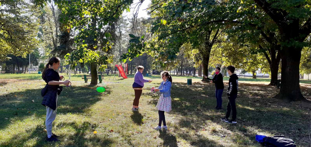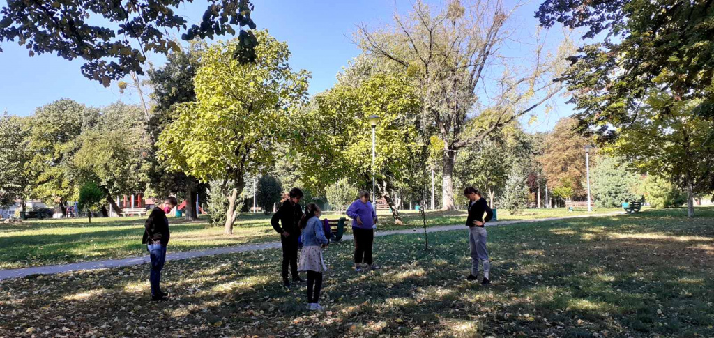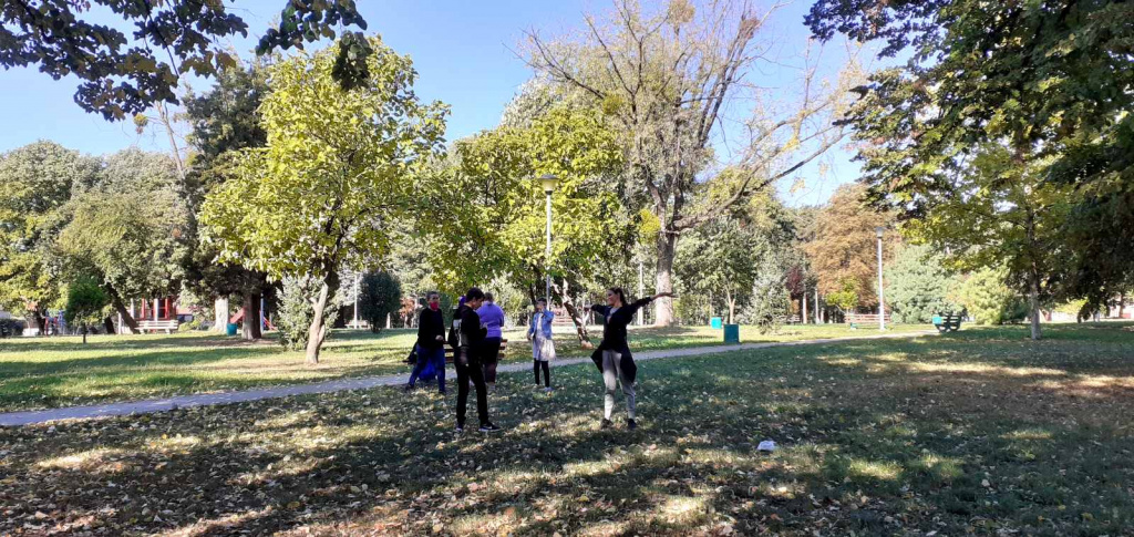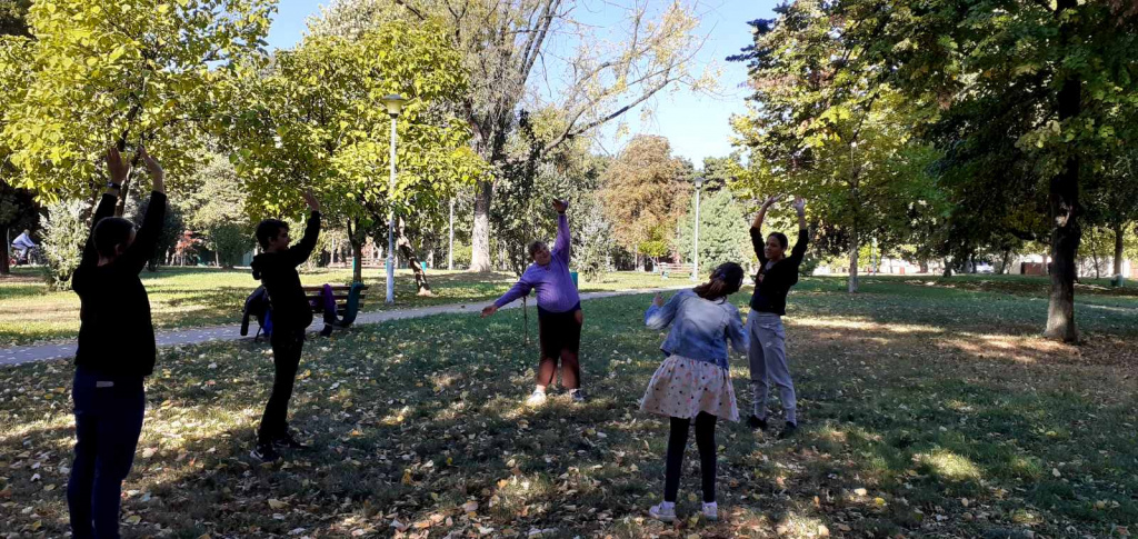 Обишли смо парк крећући се у колони по двоје трим стазом.Парк је прекривен лишћем и иглицама, док су велике травнате површине идеалне за рекреацију, аеробне вежбе и истезање. На првој травнатој површини, на самом уласку у парк, распоређени у круг, урадили смо вежбе обликовања, равнотеже и истезања. У делу парка обраслог четинаром сакупљено је нешто шишарки од којих ће се у децембру направити украси за јелку. На травнатој површини поред четинара прескакале су се вијаче, додавало се лоптом на еластичној узици.