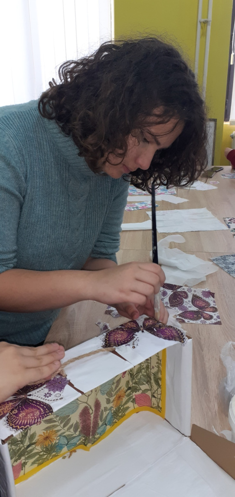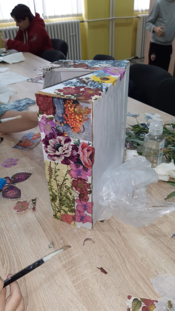 димензијама кутије. Друга група је постављала укројене салвете на кутију и на њих наносила широким четкицама