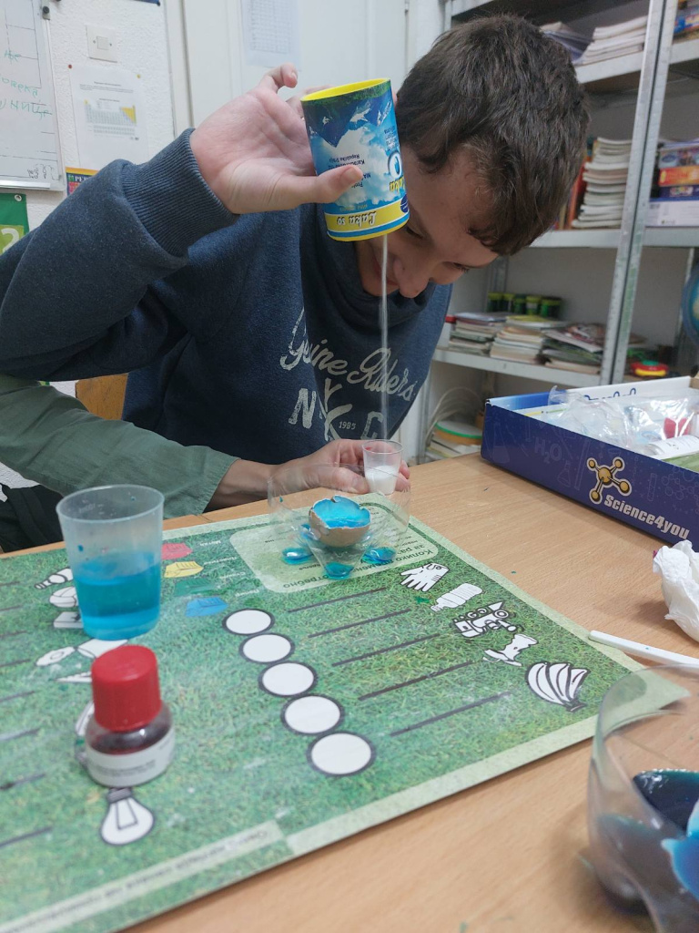 Ученици су током уводног дела часа поновили базична знања о основним хемијским појмовима: материји, супстанци, мерењима у хемији, прибору који се користи у школским хемијским лабораторијама, смеше а потом и приступили практичном делу током којег су имали задатак да уз подршку наставника тумаче упутство за рад, упознају се са свим супстанцама које се користе у датом огледу и направе смешу која ће испаравањем вишка течности дати кристале натријум хлорида . Ти кристали су уз додатак фотолуминисцентне боје створили ефекат на љусци јајета-''светлуцаво јаје''.