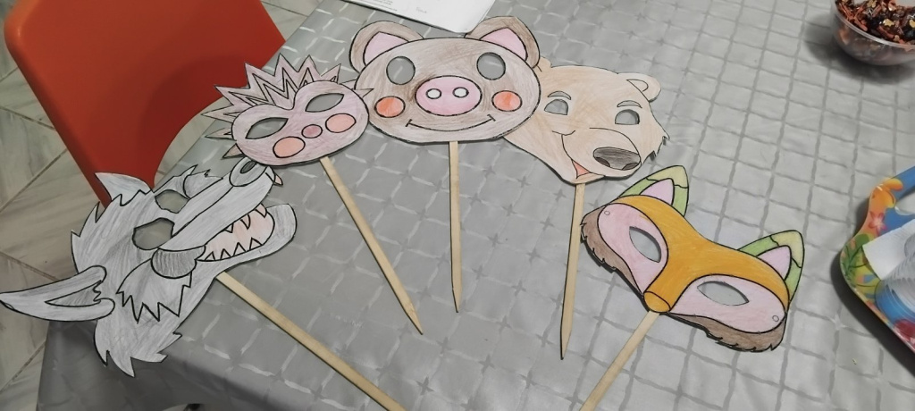 српског језика и логопедских вежби. Маске су израђене бојањем дрвеним бојицама по